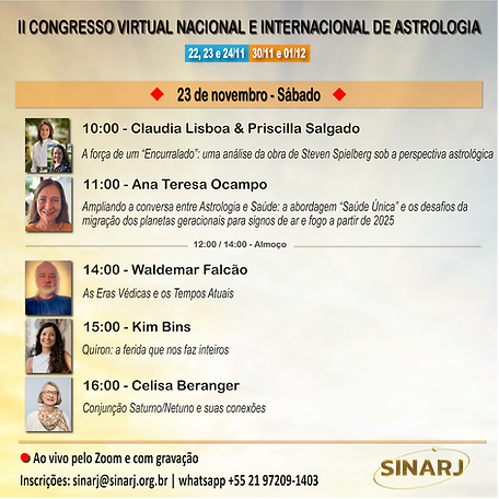Temos o prazer de anunciar o lançamento oficial do II Congresso Virtual Nacional e Internacional de Astrologia, reunindo um grande elenco de palestrantes brasileiros e estrangeiros e celebrando mais um evento especial promovido pelo SINARJ.